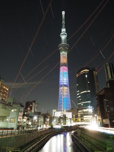 東京スカイツリー展望デッキからの夜景。 雄大な隅田川と隅田川橋梁群(桜橋、白髭橋)を一望できる。 都心にはない下町独特の低層住宅街の穏やかな夜景が心安らぐ。