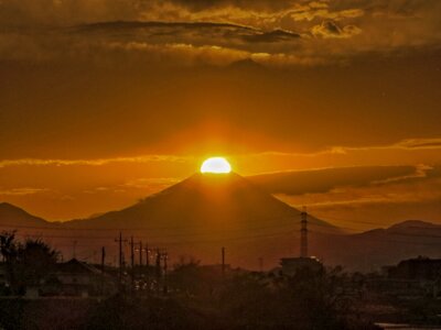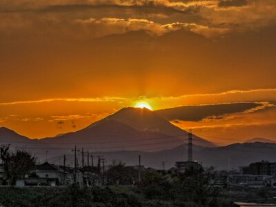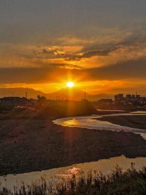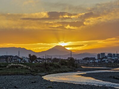 16:07 蛇行する川の先に富士山が見えます。ダイヤ前は時々雲がかかりましたが、夕日半分ほどの隙間ができ雲の下に夕日が出て来ました。蛇行する川もオレンジに染まりました。