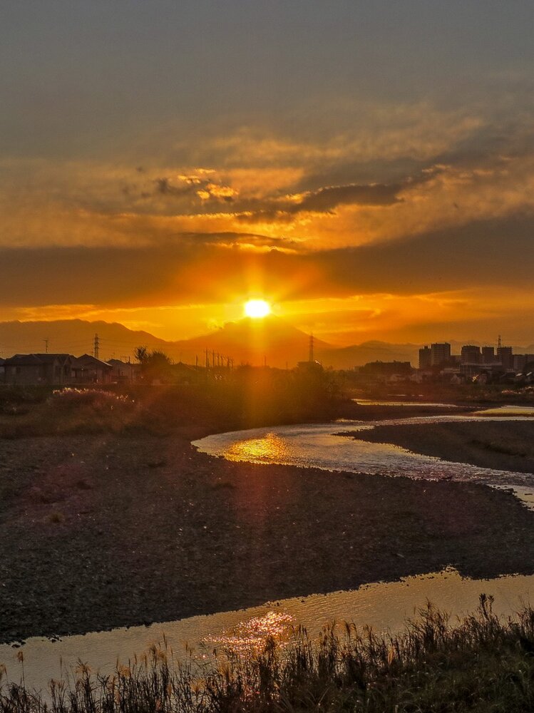16:09 蛇行する川の先に富士山が見えます。ダイヤ前は時々雲がかかりましたが、夕日半分ほどの隙間ができ無事ダイヤモンド富士ゲットできました。蛇行する川もオレンジに染まりました。