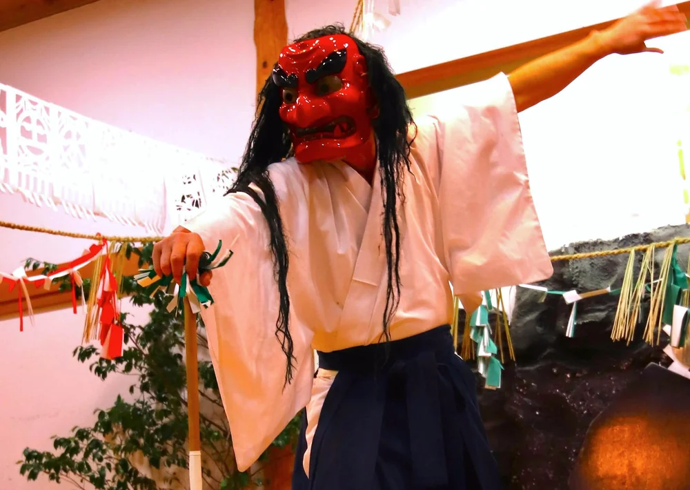 毎年11月から2月まで高千穂の各地で行われる神楽。全演目はまる一昼夜を費しますが、高千穂神社では年間通して20時より1時間で分かり易い演目を演じて頂けます。(予約優先)
