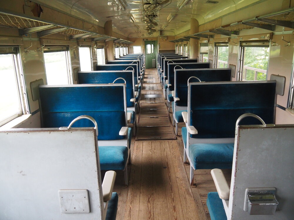 旧国鉄の幸福駅に展示されている電車の中です。 木の床やせまめの4人のボックス席、そして天井には、レトロな扇風機があります。 映画の撮影場所にもなるのではないかと考えてしまいました。 あの頃の電車の旅には、駅弁にお茶や冷凍ミカン、ホームで売り子さんがいる風景が懐かしいです。