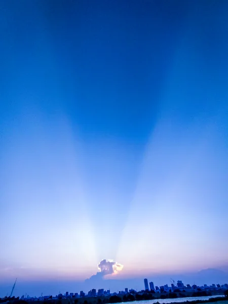 天割れ(てんわれ)」は、発達した積乱雲(入道雲)の後ろに太陽が隠れることで、光と影の筋が伸びて空が割れているように見える現象「反薄明光線(はんはくめいこうせん)」の俗称です。太陽と正反対の位置にある「対日点」に向かって光と影が収束して見える、幻想的で美しい気象現象です。 18:04 太陽側