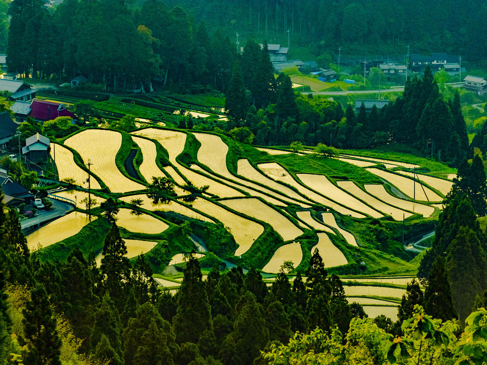 畑地区の棚田は、「日本の棚田百選」にも選ばれている美しい棚田で、田植え直後頃、集落の西方山麓に回り込む基幹林道の最上部付近から俯瞰した構図で撮影したものです。 日の出とともに、谷間には徐々に陽光が差し込み、水を張った棚田全面が黄金色に染まって来ました。 #funtotrip #絶景