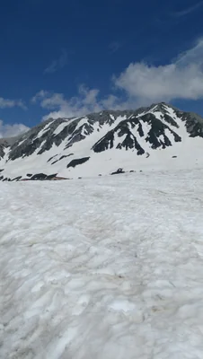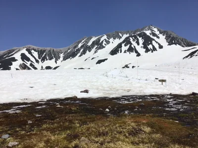 室堂平に出て正面に見える夏雲を背景にした雄山、大汝山、富士ノ折山、真砂岳。