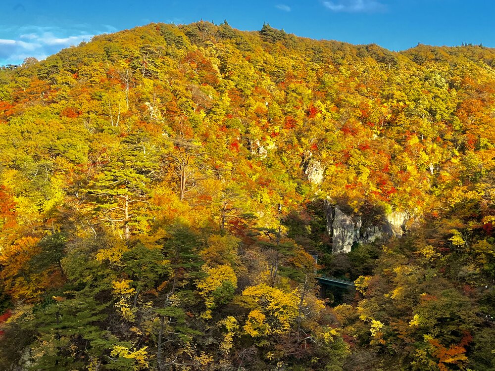 錦繍の峡谷を渡る列車