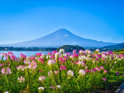 小舟の釣り人がちょうど重なってまるで雄大な富士山が見守っているような様子