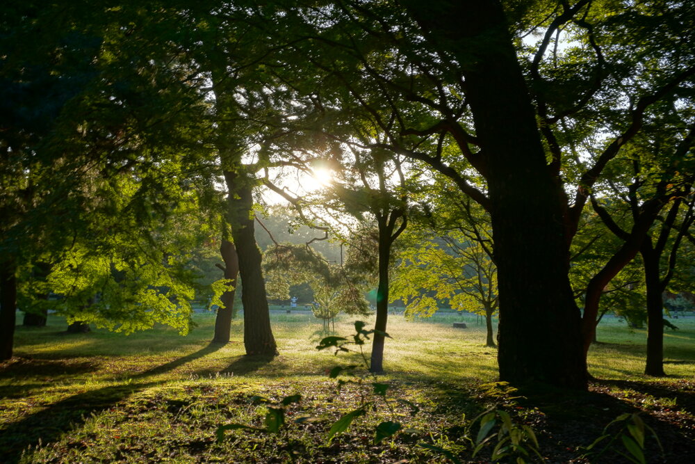 早朝散歩中に偶然木々の葉っぱから朝日が差し込み、木のシルエットと葉の緑が良い感じ。