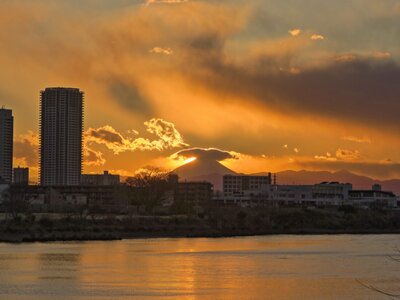 一時山頂は見えていましたが、ダイヤタイムには右から流れてきた雲に阻まれてしまいました。川面にはサンロードができオレンジに染まりました。 17:15