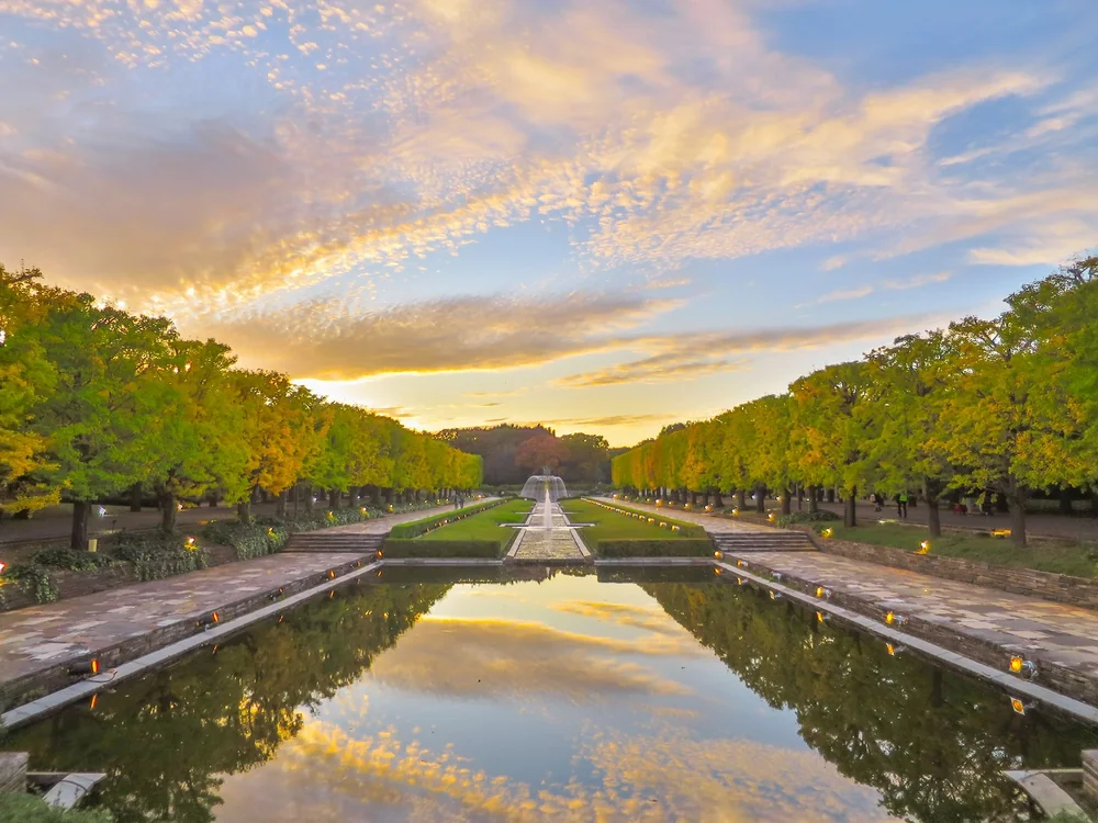 イチョウ並木の黄葉と夕焼け雲のリフレクション