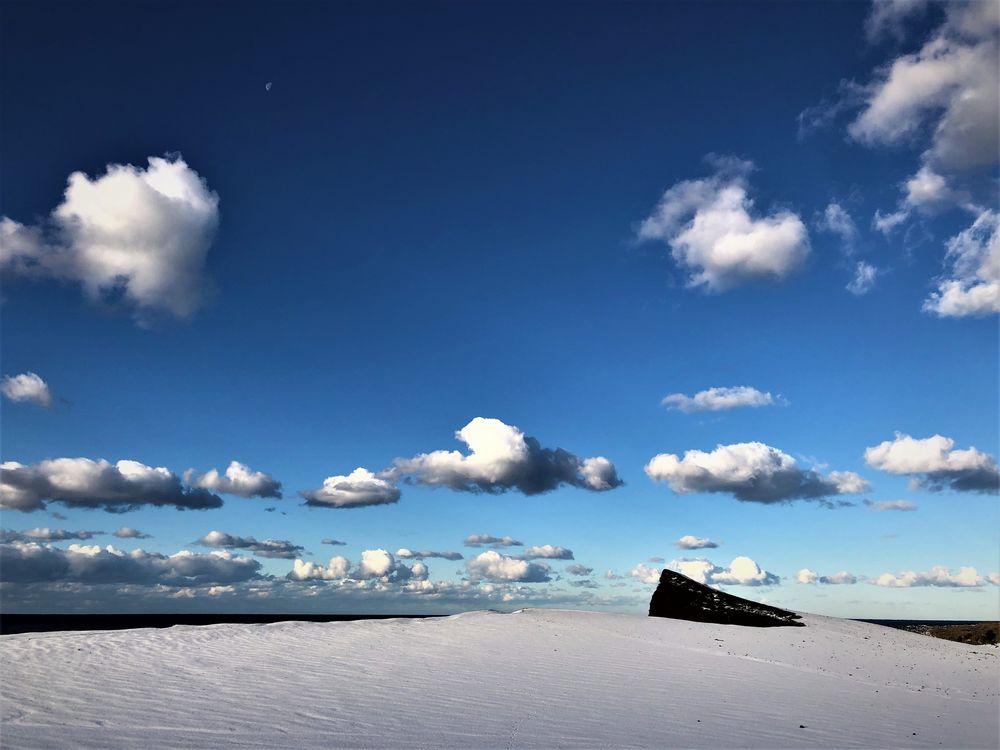 三宅島のダイヤモンドヘッド、新鼻新山(にっぱなしんざん) 小さく写る月と昨夜、降り積もった雪 東京から180キロ南の島、それも海がすぐそばの海岸線 1983年の噴火でできた火口のカーブに積もる真っ白な雪 自然は待ってくれない。突然の絶景、空には小さく月も出ていた。 こんな瞬間が三宅島にはあります。ぜひ季節を問わず、訪れてみてください。毎日クジラも見れています。