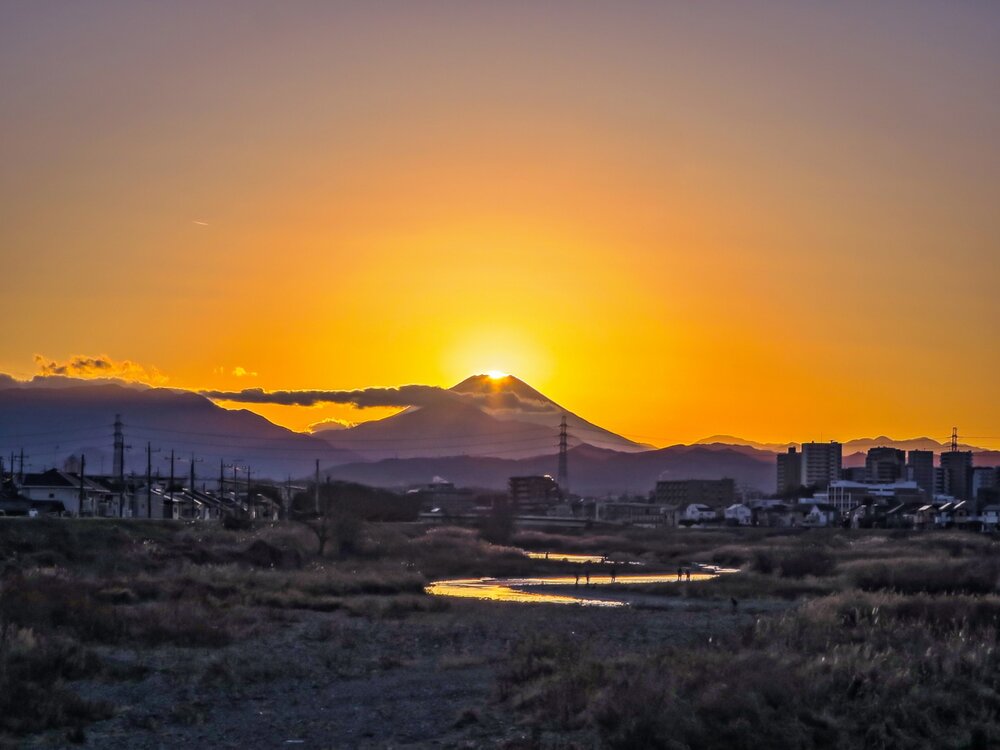 16:33 蛇行する川の先に富士山が見えます。夕日は山頂真ん中に沈んでいきました。蛇行する川もオレンジに染まりました。河原にも多くの人がいました。