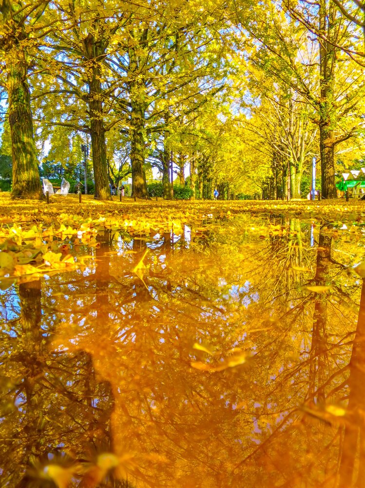 イチョウ並木の黄葉のリフレクション