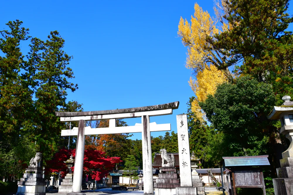 多賀大社のイチョウとモミジが見頃を迎えて青空に映えます