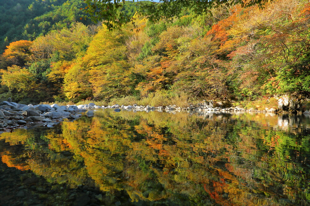 阿寺渓谷の紅葉 水面の反射