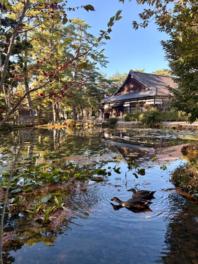 池のほとりでは、2羽のカモが寄り添うように穏やかに泳いでいます。 水面には青空と木々がやさしく映り込み、風もゆるやかに感じられます。 奥に見える趣のある建物が、この景色に静かな深みを添えていて、まるで時間がゆっくりほどけていくようでした。 赤い実や緑の葉がそっと彩りを添え、何気ない一瞬がとても愛おしく感じられました。