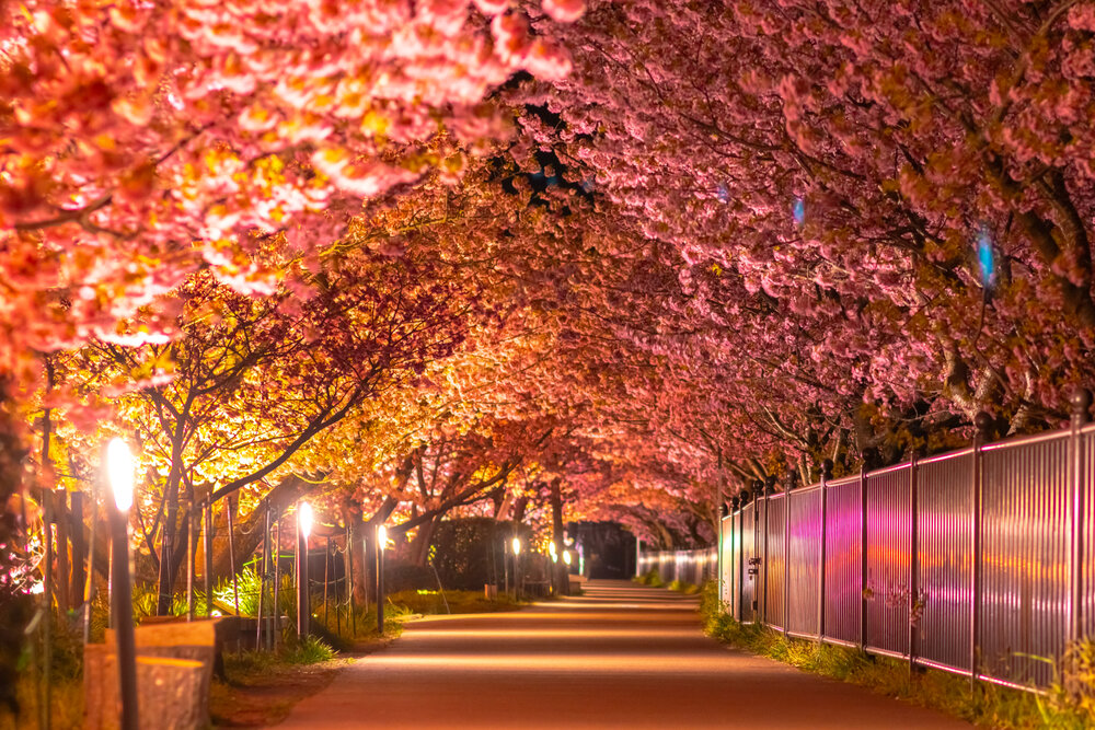河津川沿いの歩道に沿って河津桜のトンネルが続きます。 夜にはライトアップされます。