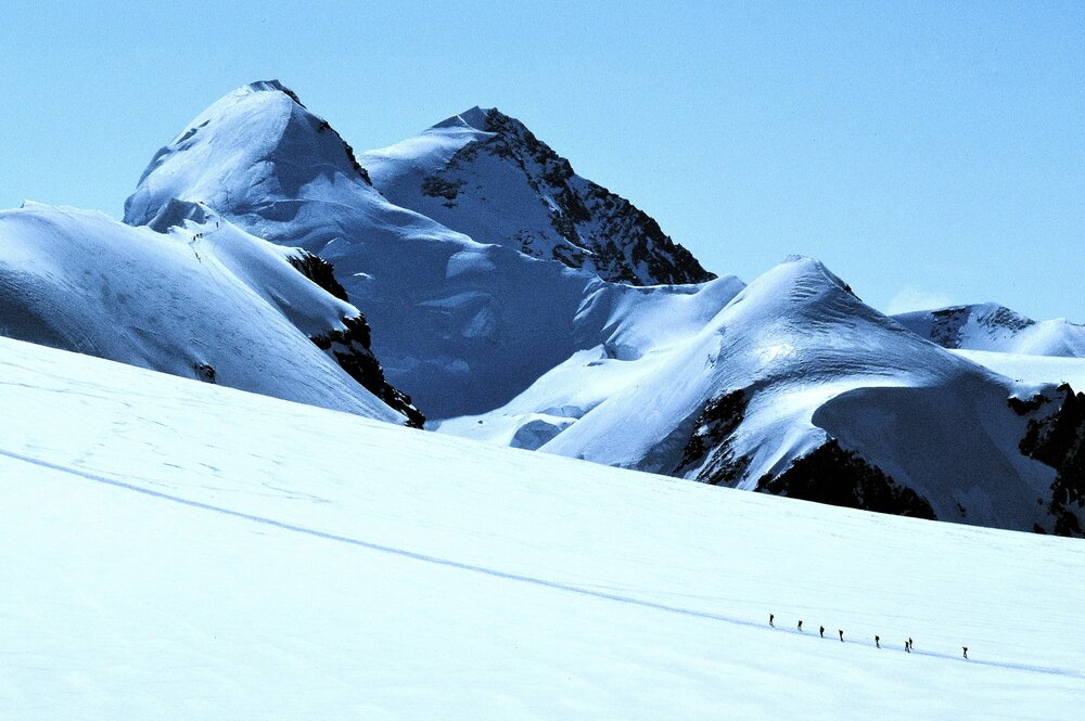 夏のスイスアルプス。ブライトホルンへの登山者たちが小さく見えた。後方にはずっと高いリスカムと登山者たち。この開放感がスイスアルプスの魅力。