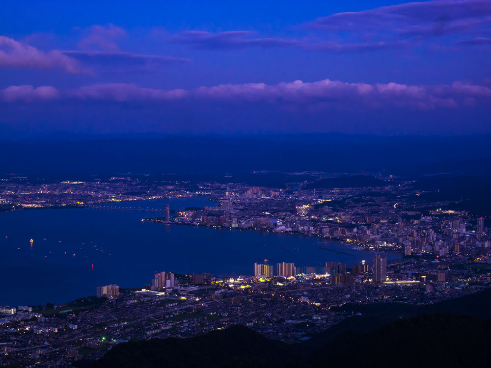 暮れ行く琵琶湖と大津市街の夜景