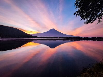紅葉した道路と笠雲富士
