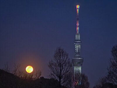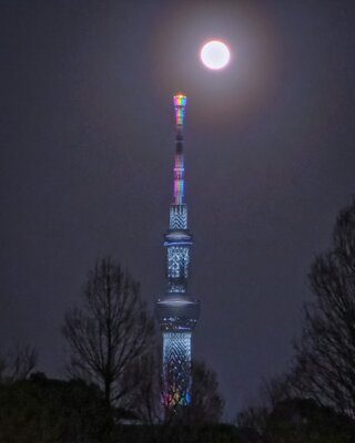 満月の周りに花粉光環が出たパールスカイツリーになりました。 18:38