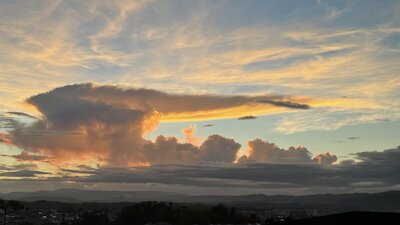 年明け早々に窓の外が夕焼け空だったので、見晴らしの良い場所に行くとまるで鳳凰が飛翔しているかの様な雲が。 木々の間から撮影。 なんだかいい事がありそう。