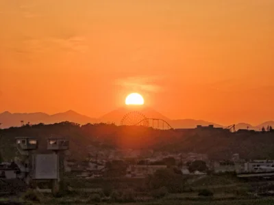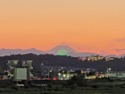 ライトアップされたツイン観覧車とジェットコースターと夕富士