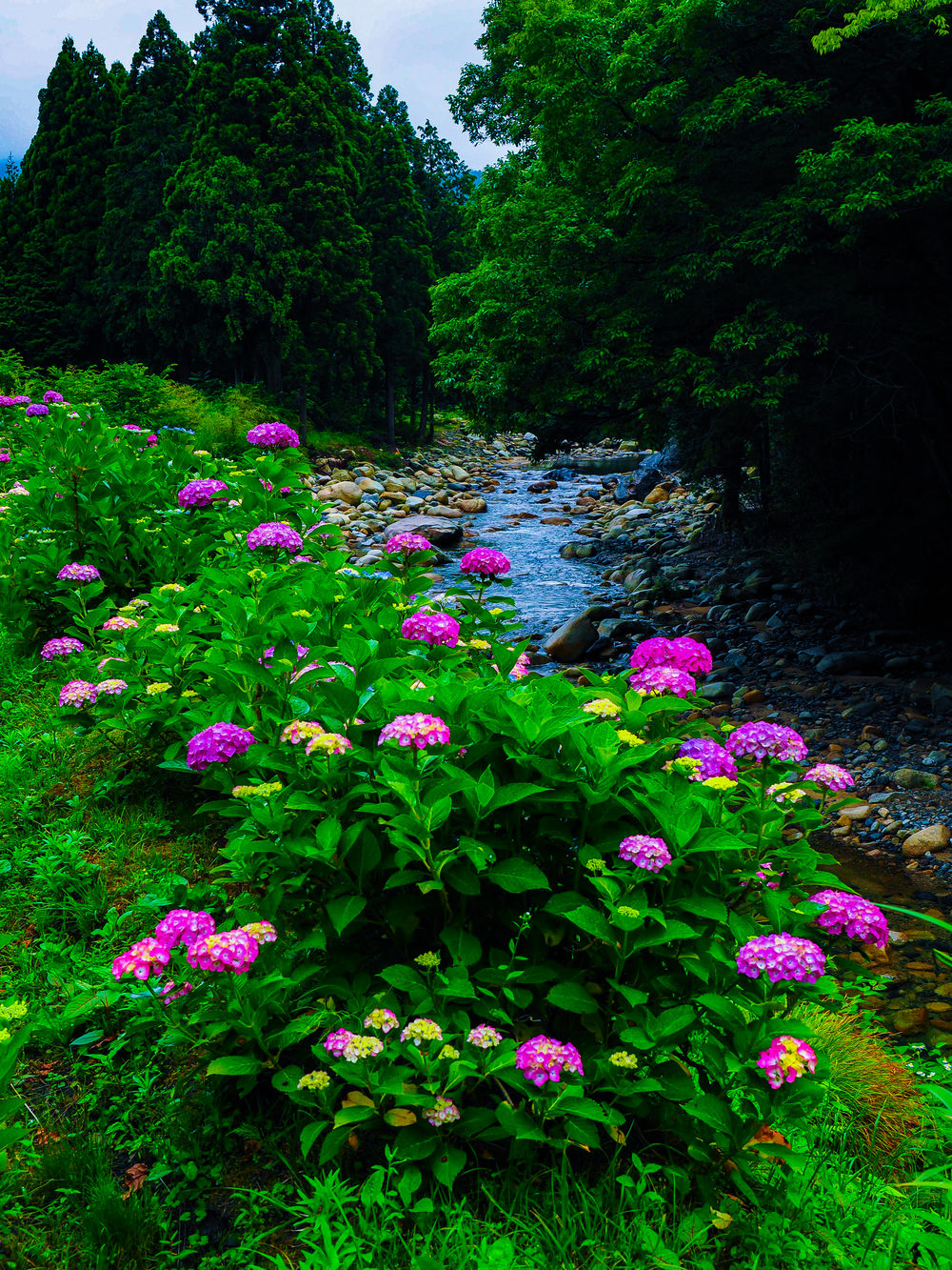 *滋賀県高島市富坂集落内を流れる鴨川沿いにある名前のない紫陽花園です。 由緒のある大庭園などではありませんが、「畑の棚田」撮影の帰りに通りかかったときに「はっ!」と思い立ち寄って撮影しました。 恐らく地元の方が丹誠を込めて咲かせたのだと思いますが、他所に負けないほど美しい場所で、穴場中の穴場です。