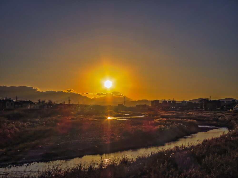 16:26 蛇行する川の先に富士山が見えます。蛇行する川にも写ってトリプル夕日です。河原にも多くの人がいました。