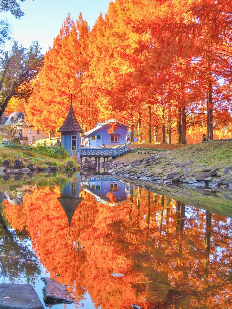 メタセコイア並木の紅葉と青い建物のリフレクション