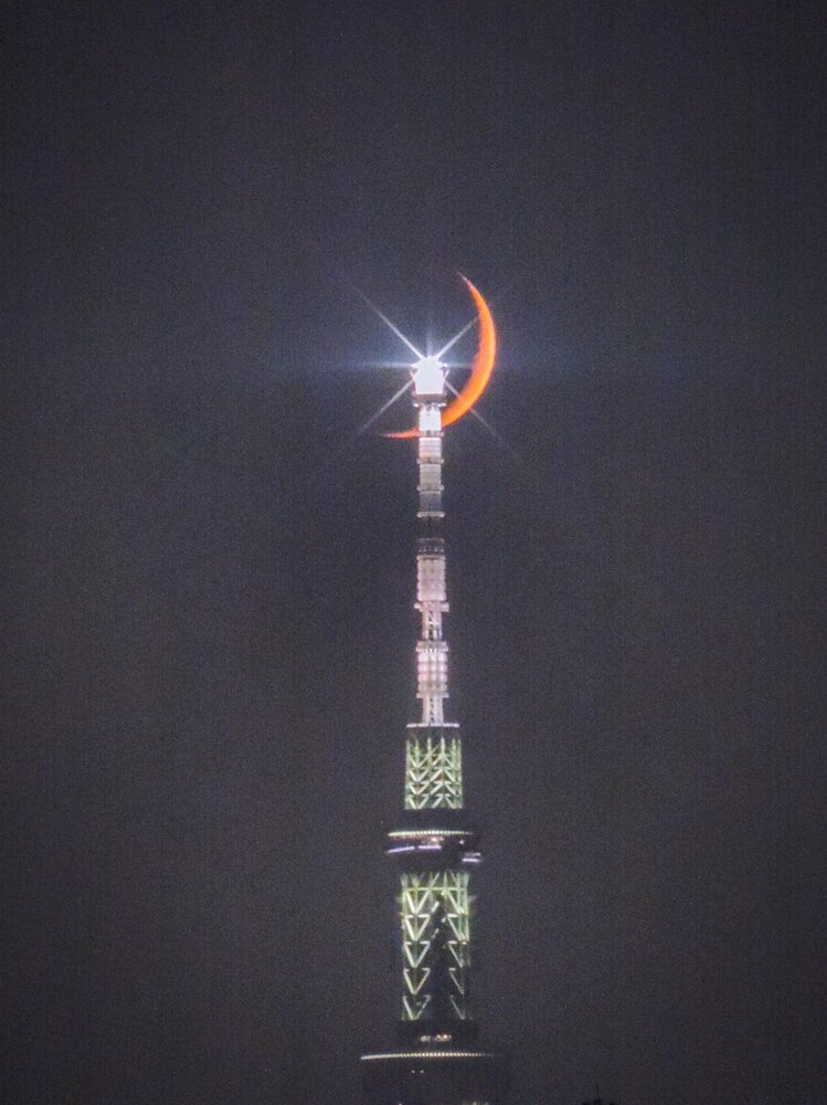 スカイツリーにクロスする四日月
