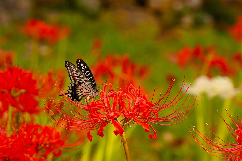 昭和記念公園で曼殊沙華を撮っていたら、偶然蝶がとまった。 秋の到来を感じる一枚になった。