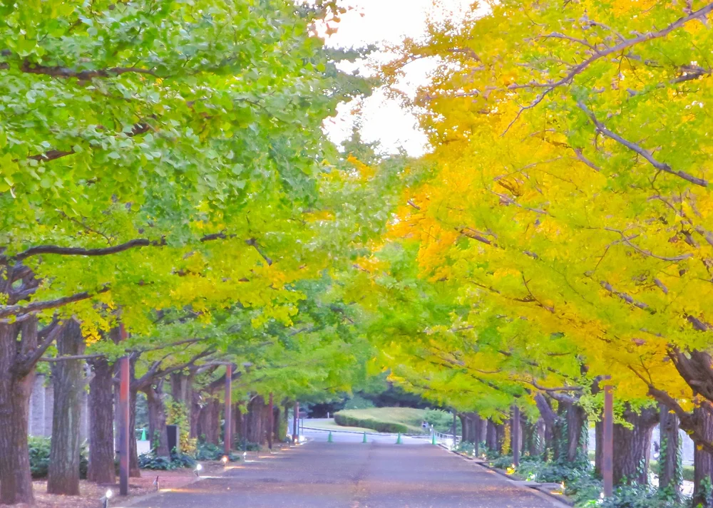 イチョウ並木の黄葉と夕焼け雲のリフレクション