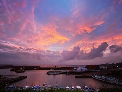 秋の夕陽の時間帯は静かで涼しい風が吹き、 遠く台風のウネリが海岸に届き、低く重たい波の音が身体に響く