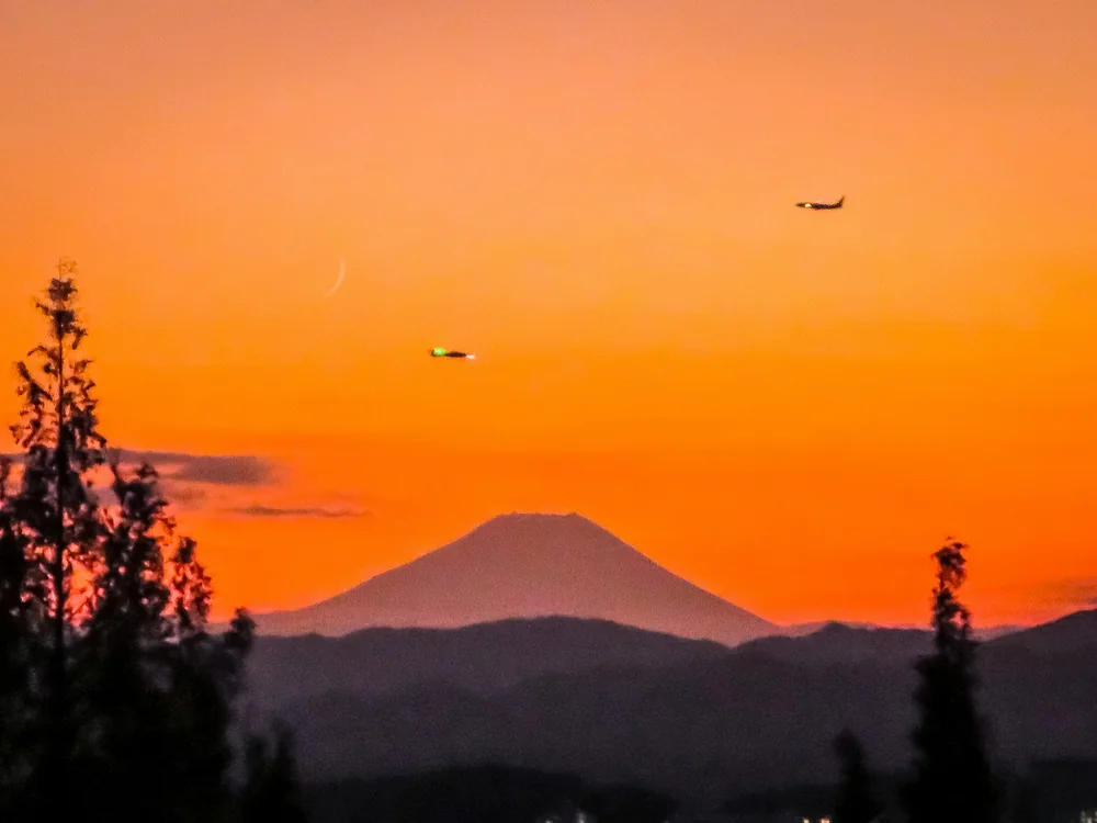 近くの横田基地を離陸した航空機が富士山の上ですれ違いました。 16:59