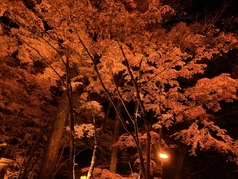 月明かりの元ライトアップされた紅葉