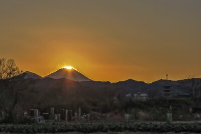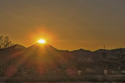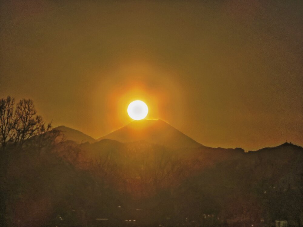 16:24 新年初めて雲のないダイヤモンド富士になりました。その分強烈な太陽光でした。