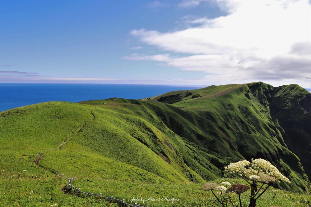 礼文島桃岩登山口から島南端の知床地区迄の5.3kmのトレッキングコース。草原の中にキンバイの谷とその先のツバメ山へと繋がる一本道が延々と続いています。白い空、青い海、緑の草原が目の前に展開しています。