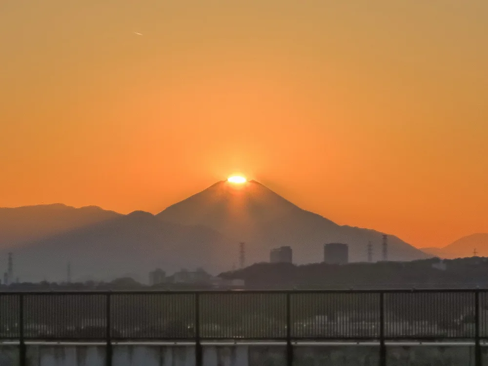 駅前の商業施設屋上からのダイヤモンド富士です。コンクリートの上にフェンスが追加されたため後ろに下がっての撮影になりました。 16:16