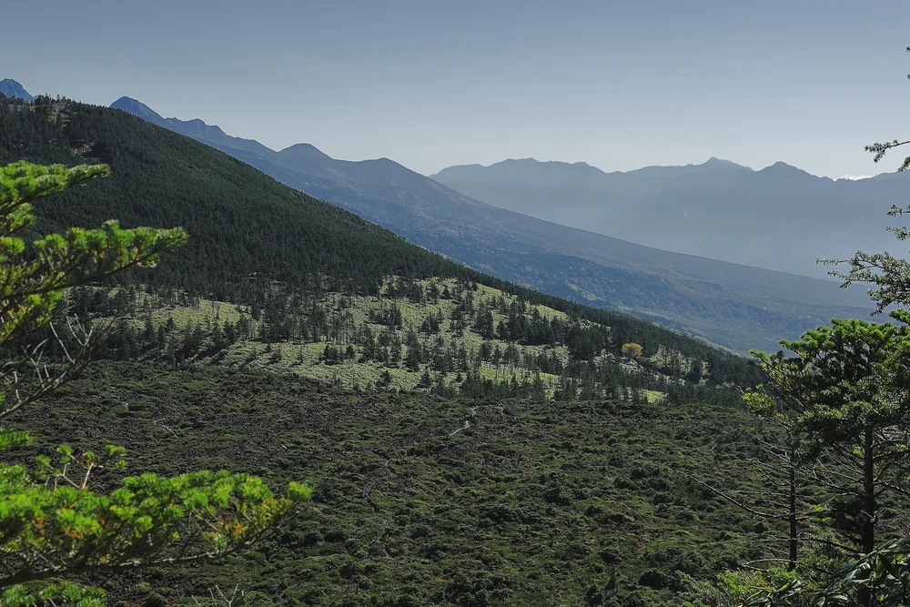 北八ヶ岳横岳の約800年前の爆裂火口から噴出した溶岩流が黒く溶岩台地を形成し、その上をハイマツ樹林が覆っている坪庭が登山道の眼下に見えます。坪庭探勝コースは一周30〜40分で楽しめるハイキングコースです。