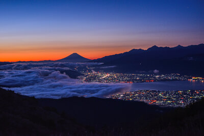 2022/10/2 5:05 長野県塩尻市高ボッチ高原 ※白み始めた頃から富士山が見えてきました。雲海は出ませんでしたが、雲がきれいに焼けてくれました。諏訪湖周辺の街明かりは宝石箱のようです。