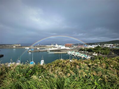 台風接近前日の夕方に空が燃える。 漁港の船はすべてロープで養生されて台風に備えた 自然の映す妖艶で燃えるような空と漁師の生活が集まる現実 港に映る空の色とロープのラインが、台風前にしか見られない絶景を作っている。