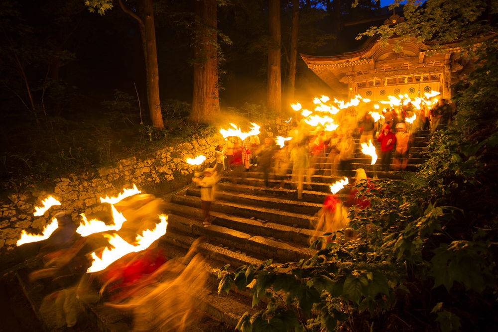 毎年6月に行なわれる大山大神山神社奥宮の松明行列です。 山岳信仰の神社から日本一の石畳の参道を下る、厳かで幻想的な炎の祭りです。