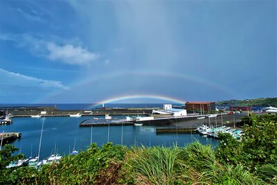 大荒れで西の強風の中、朝のスコールでうっすらと虹がかかった