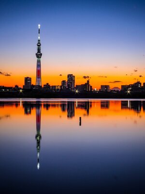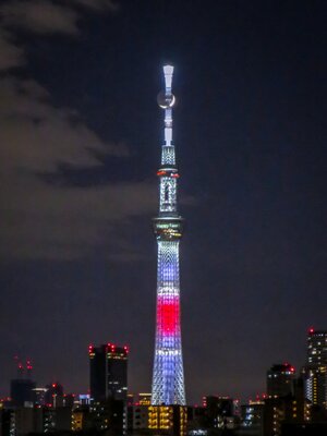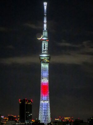 17:50 雲が多く撃沈濃厚でしたが、粘ったら雲が切れ三日月が見えてきました。天辺には乗せられませんでしたが、何とか金星も入れてコラボできました。 スカイツリーは日の丸をイメージした新年特別ライティングです。