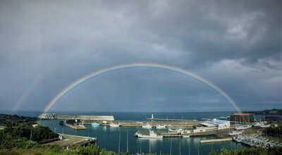 雨の降る夕陽の時間、山の方を見上げると大きな虹がかかっていた。 途中が切れていて完璧じゃなけど、ダブルレインボーだった。