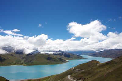 ヤムドク湖湖畔より撮影。 ヤムドク湖は中華人民共和国藏族自治区にある湖面海抜4400Mの湖であり、ナムツォ湖、マーナサロ湖とともにチベット三大聖湖である。 拉薩からギャンツェに向かう途中の道にある。