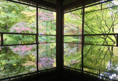 瑠璃光院の漆塗りのテーブルに映る紅葉は有名ですが、1階にある臥龍の庭は、時間によって陽の光を浴びた紅葉が池に映り絶景です。青もみじが赤くなるころの、紅葉の赤と苔の緑とのコントラストが楽しみです。