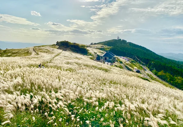 和歌山県の紀美野町と有田川町にまたがる生石高原。 標高870mの生石ヶ峰のなだらかな山上に草原が広がる生石高原(おいしこうげん)は、360度の眺望と四季おりおりの草花に彩られ、特に秋は関西随一と言われるほどのススキ野原が有名です。 陽光に照らされたススキの草原が銀色や金色の大海原のように見るものを魅了します。山の斜面に突き出た「火上げ岩」は高野山開山前の弘法大師空海が大火を焚いて雨乞いをしたと伝えられる大岩です。今や人気の撮影スポットになっています。