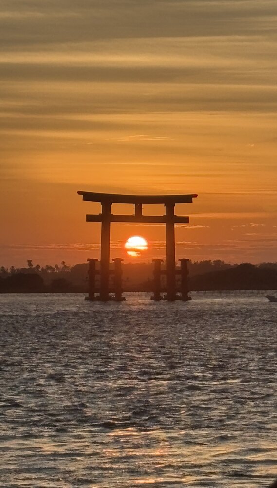 弁天島海浜公園に存在する鳥居に夕日が沈んでいく様子。 鳥居の中央に夕日が位置する瞬間はほんの数分である。