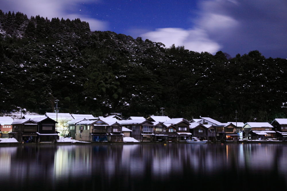 雪の降った夜、丹後路を目指す。伊根の舟屋に積もった雪と蒼い夜空が幻想的だった。